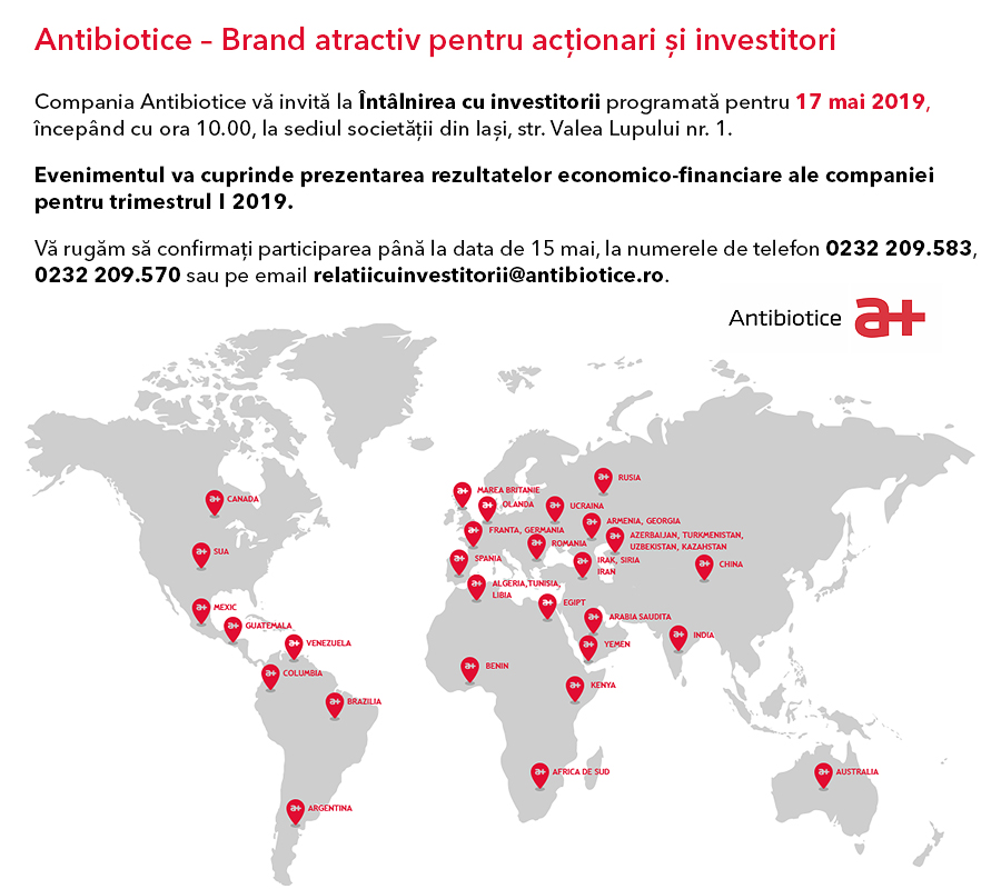Antibiotice S.A. Iasi informeaza investitorii ca in data de 12 august 2019, ora 11.00 va avea loc teleconferinta – Prezentare rezultate financiare Semestrul I 2019, organizata de managementul societatii, la care sunt invitati sa participe investitori si analisti.