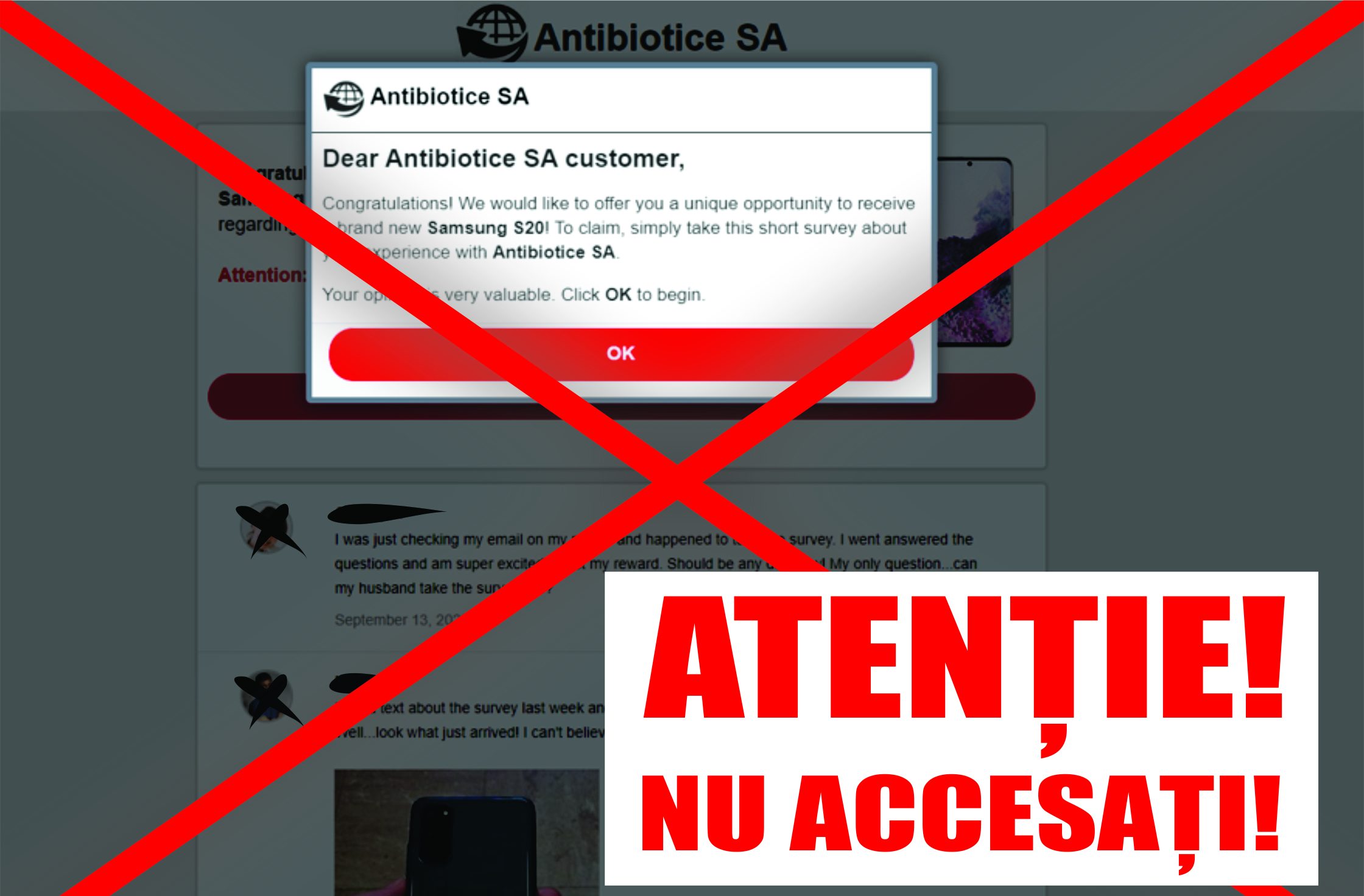 Așadar, avertizăm persoanele care primesc link-uri ce trimit spre „Antibiotice SA”, cu îndemnul de a completa un chestionar având ca recompensă sume de bani, telefoane mobile sau orice alt premiu, să NU acceseze link-urile și să NU furnizeze date la cerere pentru a câștiga eventuale premii.